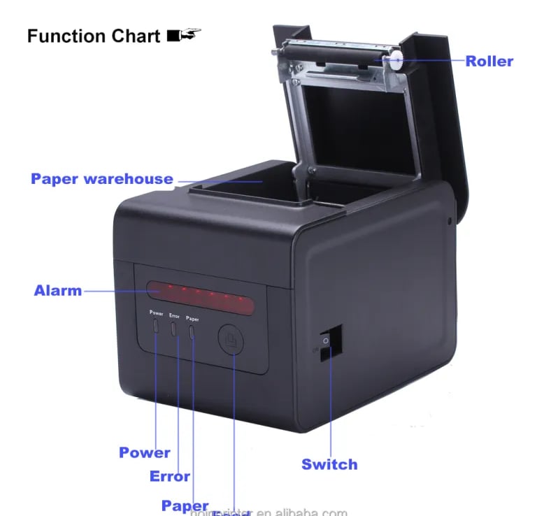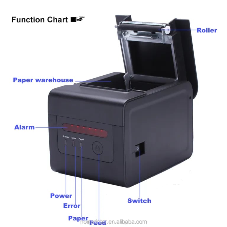Swissposs presents the stylish and high-quality kitchen receipt printer. With its movable paper guard plate design, it can support thermal paper with widths of 58mm and 80mm. This printer is equipped with a monitoring function to avoid losing any bills. It also has the capability to remind orders and provide error alarms, ensuring smooth operations in the kitchen. Furthermore, the printer boasts an excellent waterproof, dustproof, and anti-oil design, with an added oil shield for protection. The printer even features an alarm beep sound, guaranteeing efficiency and reliability in any kitchen setting.